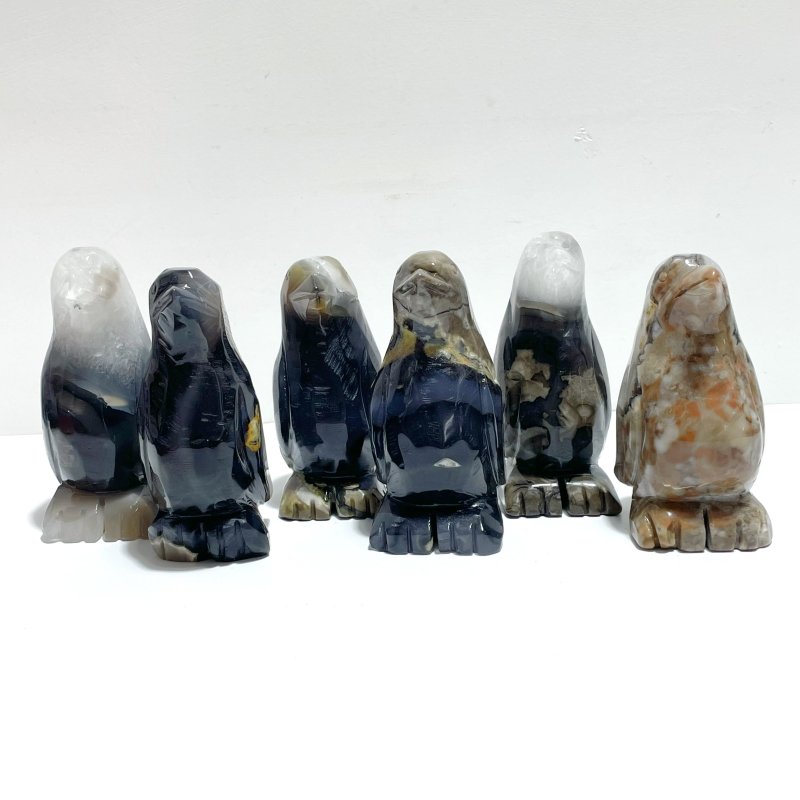 We sell our fluorescent volcanic agate penguin carving in lots that are 5pcs, you will get the same of stones as in the photo and video.